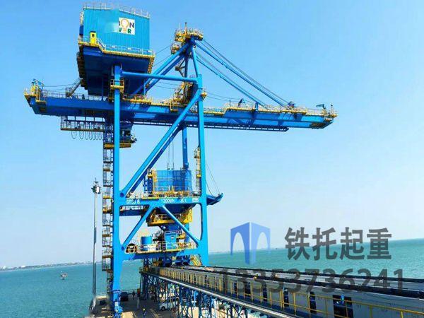 江蘇徐州卸船機生產公司橋式抓斗卸船機可在軌道上運行,門架下凈空高度可通運輸車輛,抓斗由船上抓散煤后,卸至錐形料斗。通過料斗出料口送至碼頭上的皮帶輸送機,然后送至堆場。前大梁可作俯仰動作。本機型可根據用戶需要,單獨設計。